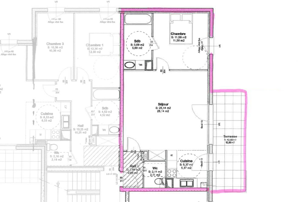 Dans un immeuble collectif, F3 de 66m² au RDC comprenant une entrée, cuisine ouverte sur séjour, 2 chambres, salle de bains, wc, terrasse.