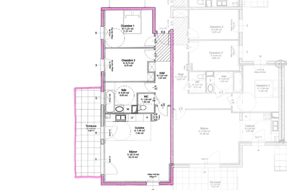 Dans un immeuble collectif, F3 de 64m² au RDC comprenant une entrée, cuisine ouverte sur séjour, 2 chambres, salle de bains, wc, terrasse.