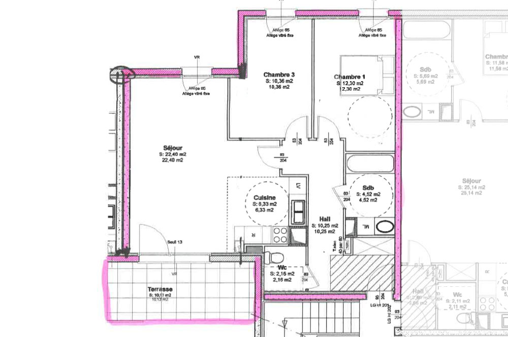 Dans un immeuble collectif, F3 de 68m² au RDC comprenant une entrée, cuisine ouverte sur séjour, 2 chambres, salle de bains, wc, terrasse.