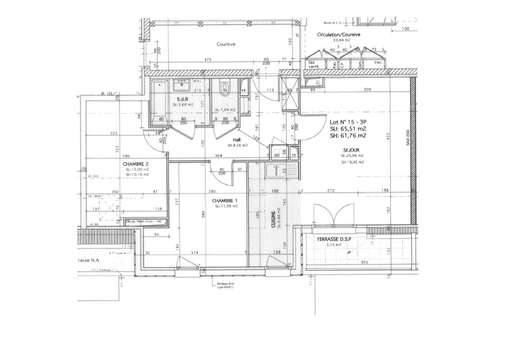 Dans un immeuble collectif, F3 de 62m² au 3ème étage comprenant une entrée, cuisine, séjour, balcon, 2 chambres, salle de bains et wc séparé.