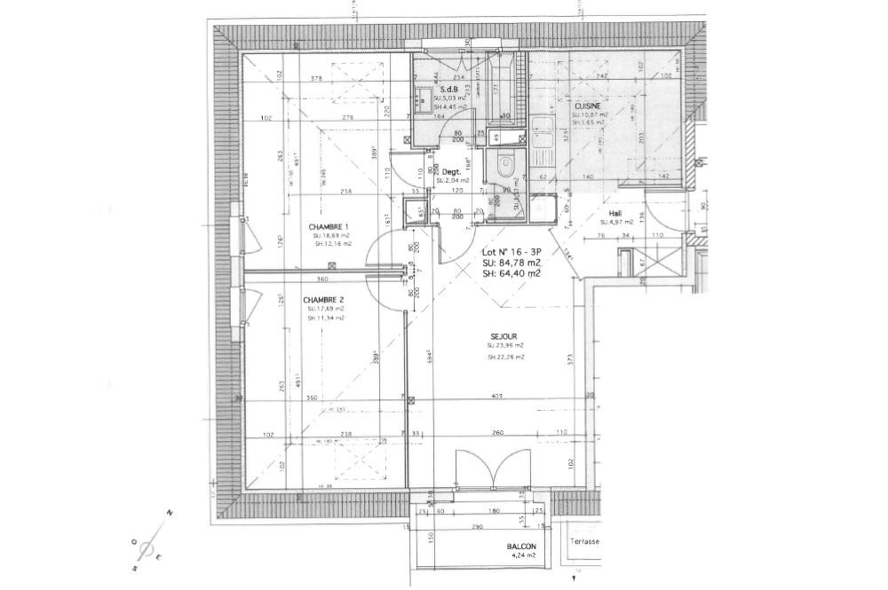 Dans un immeuble collectif, F3 de 64m² au 3ème étage comprenant une entrée, cuisine, séjour avec balcon, 2 chambres, salle de bains et WC séparé.