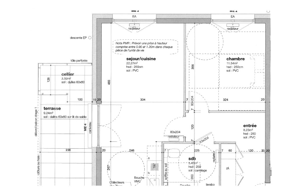 Dans un immeuble collectif, F2 de 47m² au RDC comprenant une entrée avec placards intégrés, cuisine ouverte sur séjour de 22m², une chambre, une salle de bain avec douche à l’italienne et wc, un cellier, une terrasse de 9m² ainsi qu’un jardin de 75m² orienté au Sud.