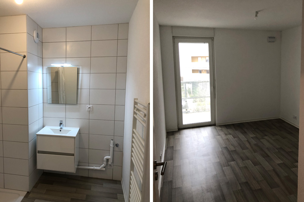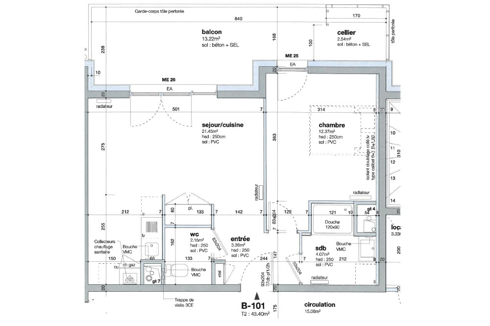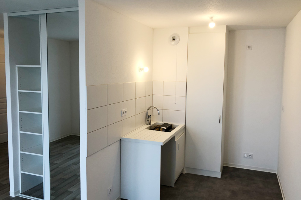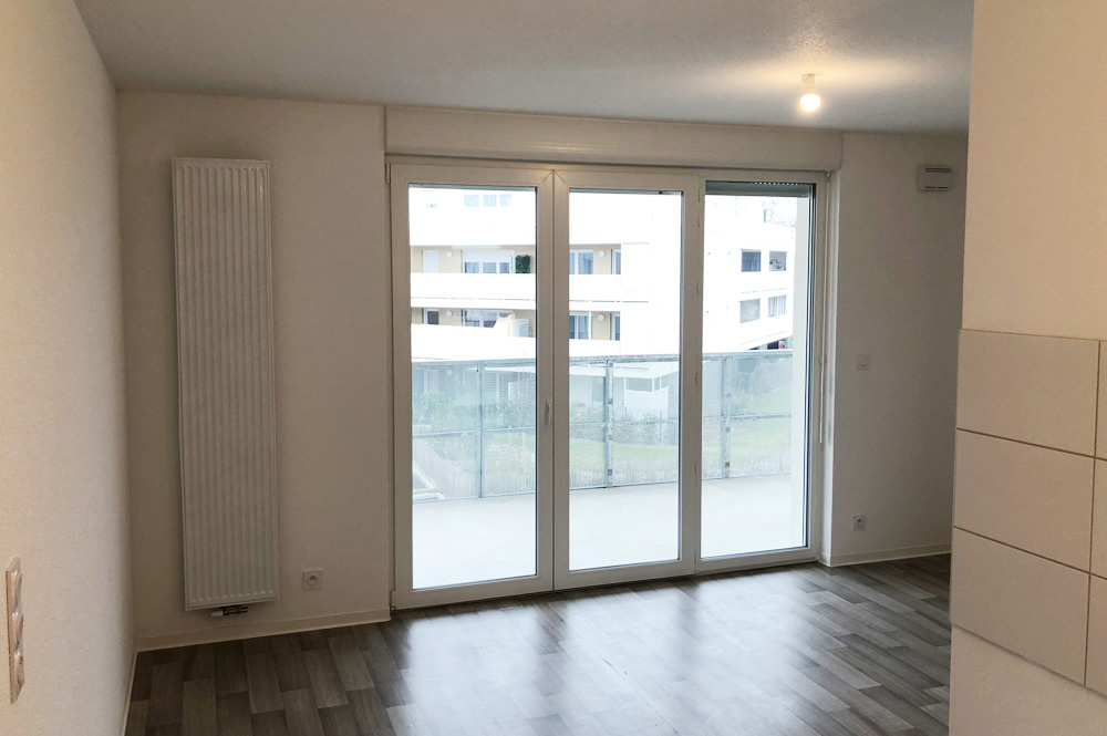 Dans un immeuble collectif, F2 de 43m² au 1er étage comprenant une entrée, une cuisine ouverte sur un séjour de 21m², une chambre, une salle de bain avec douche, un wc séparé, un balcon de 13m² et un cellier.
