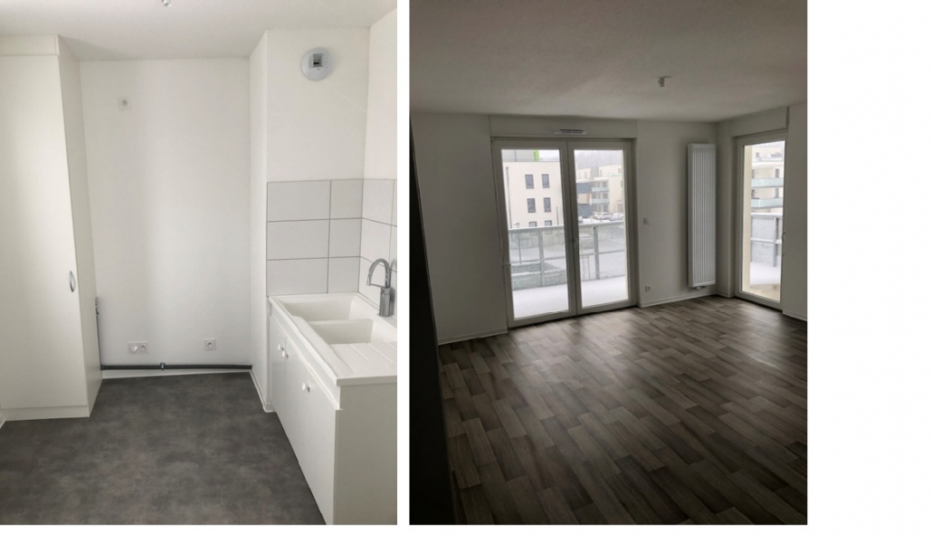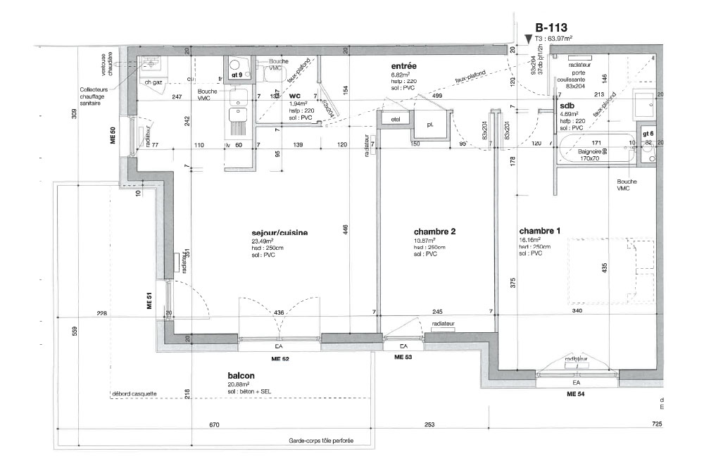 Dans un immeuble collectif, F3 de 64m² au 2ème étage comprenant une entrée avec placard intégré, une cuisine ouverte sur un séjour de 23m², deux chambres, une salle de bain avec baignoire, un wc séparé et un balcon de 20m².