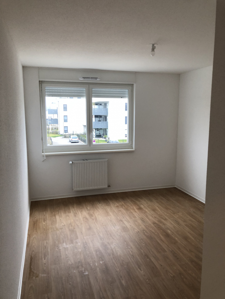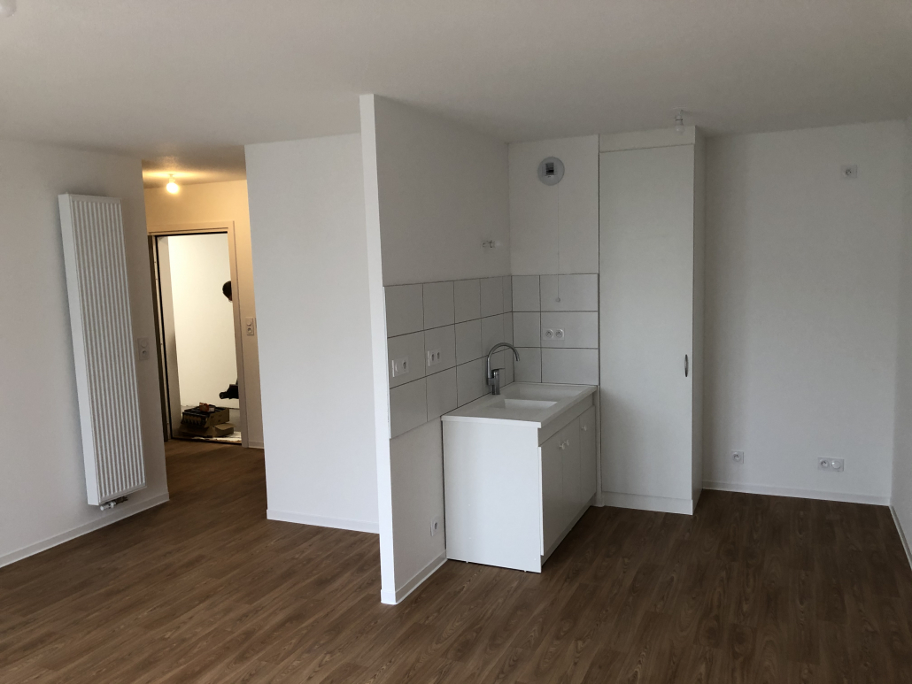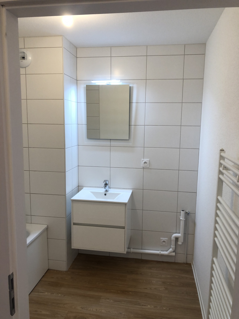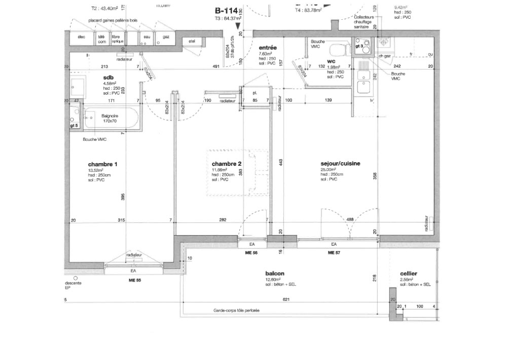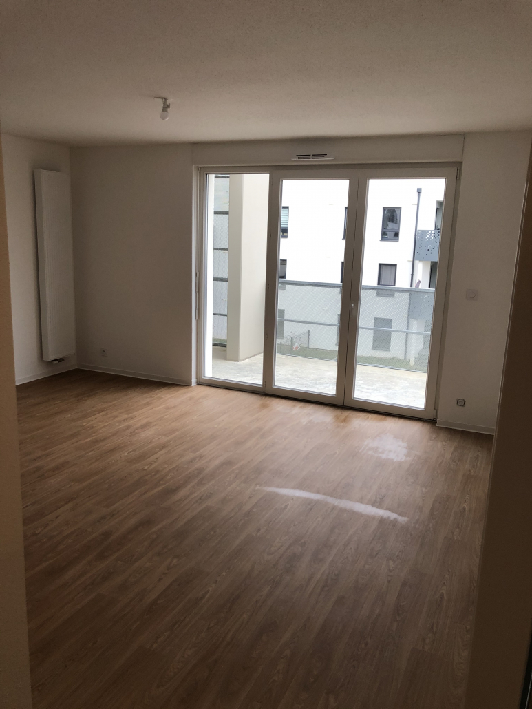 Dans un immeuble collectif, F3 de 64m² au 2ème étage comprenant une entrée avec placard intégré, une cuisine ouverte sur un séjour de 25m², deux chambres, une salle de bain avec baignoire, un wc séparé, un balcon de 12m² et un cellier.
