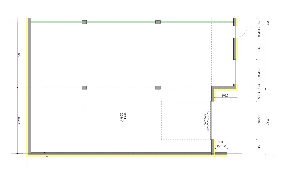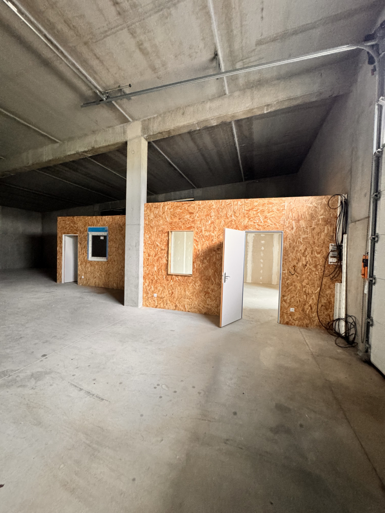 Dans un nouveau bâtiment artisanal, local nu à aménager de 205m² au RDC avec hauteur sous plafond brute de 3,91m à 5,35m, isolation thermique extérieure ép.20cm + isolation thermique de la toiture de 16cm